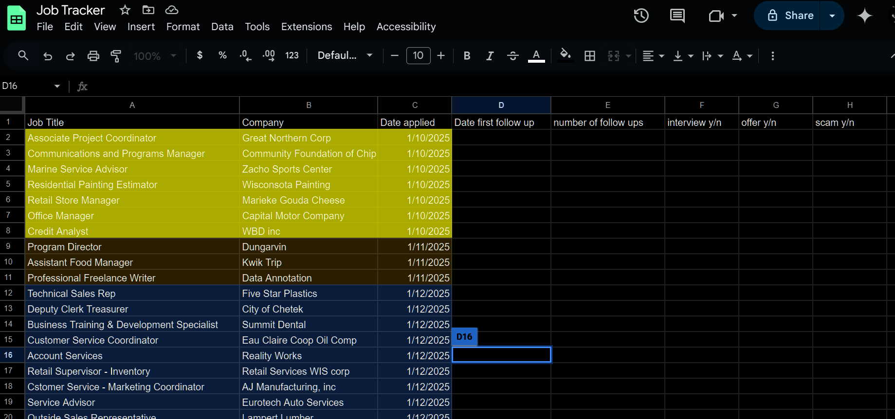 There are a few metrics that I want to keep track of through this process. Obviously, I need tabs on what position I've applied for and which companies I've reached out to. My first follow up, following the submission of my resume, will be 2-3 business days. I will then contact the company 3 times to follow up unless I am rejected beforehand. From there, I will track which contacts resulted in an interview or offer, whether or not I take them. Lastly, I'm going to track which offers are scams. If a company requires me to pay them for training, certification, or if they fully ghosts me, I will consider this a scam.
